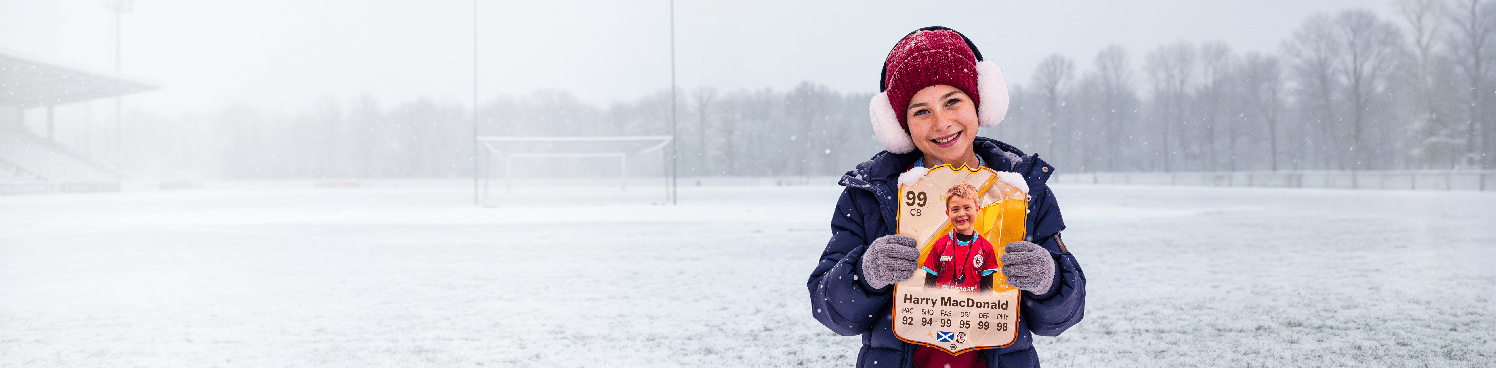 When it comes to personalising your card, the basic steps are to upload a photo and add a name to your card. Then you’ll add details like your player’s position and skill ratings out of 99 for each football skill shown on the card. Our online card builder makes this really easy. And if you aren’t a football card expert, don’t worry!
