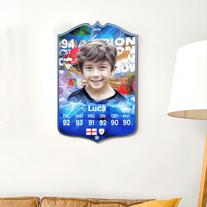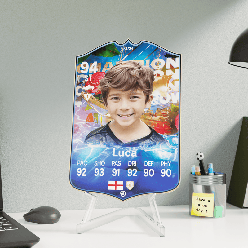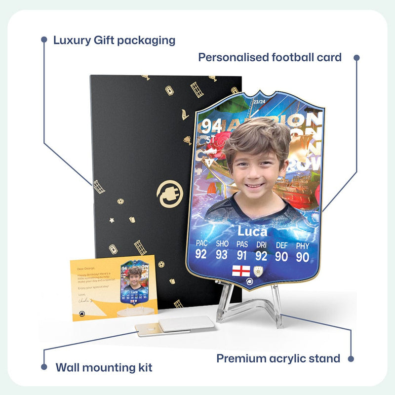 When it comes to personalising your card, the basic steps are to upload a photo and add a name to your card. Then you’ll add details like your player’s position and skill ratings out of 99 for each football skill shown on the card. Our online card builder makes this really easy. And if you aren’t a football card expert, don’t worry!