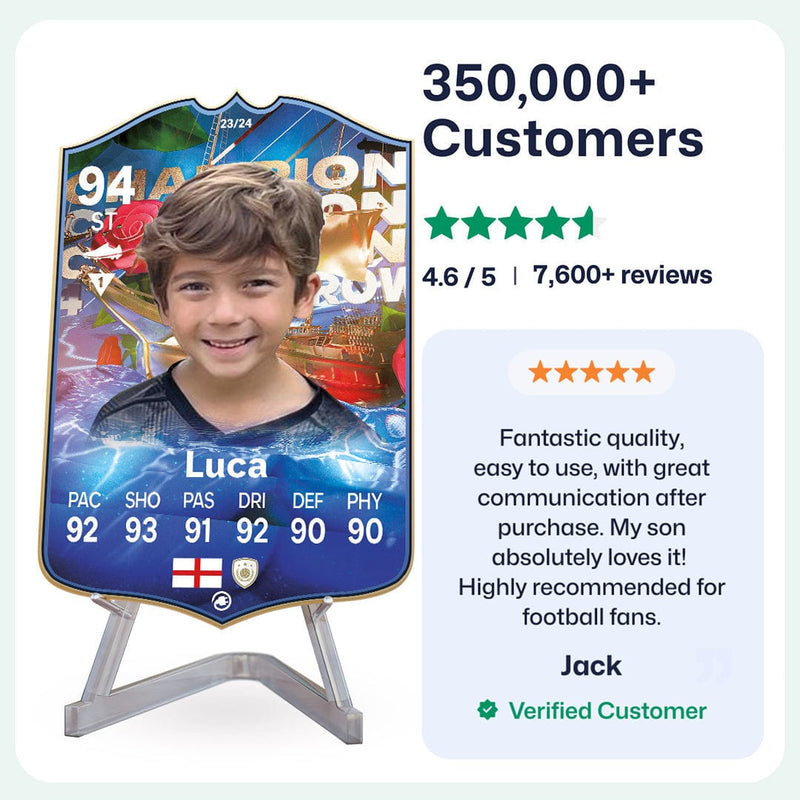 Yes! Our football card designers will remove the background from the photo you upload so it looks just like the football cards you might’ve seen games like EA FC 25, EA FC 24 or FIFA. We’ll also position the photo perfectly on the football card so it looks great. If there are any problems with the quality of your photo, we’ll reach out and let you know. Plus, our website's AI will remove the background on the image for visual purposes before purchase so you can see it without a background on the card.
