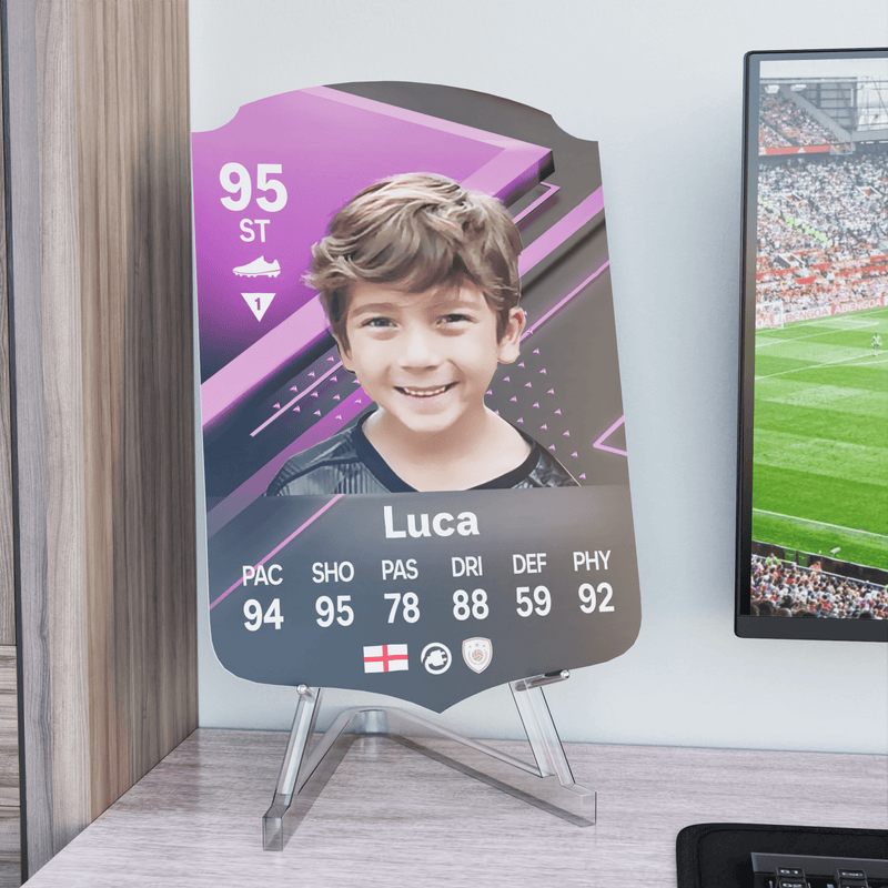 When it comes to personalising your card, the basic steps are to upload a photo and add a name to your card. Then you’ll add details like your player’s position and skill ratings out of 99 for each football skill shown on the card. Our online card builder makes this really easy. And if you aren’t a football card expert, don’t worry!