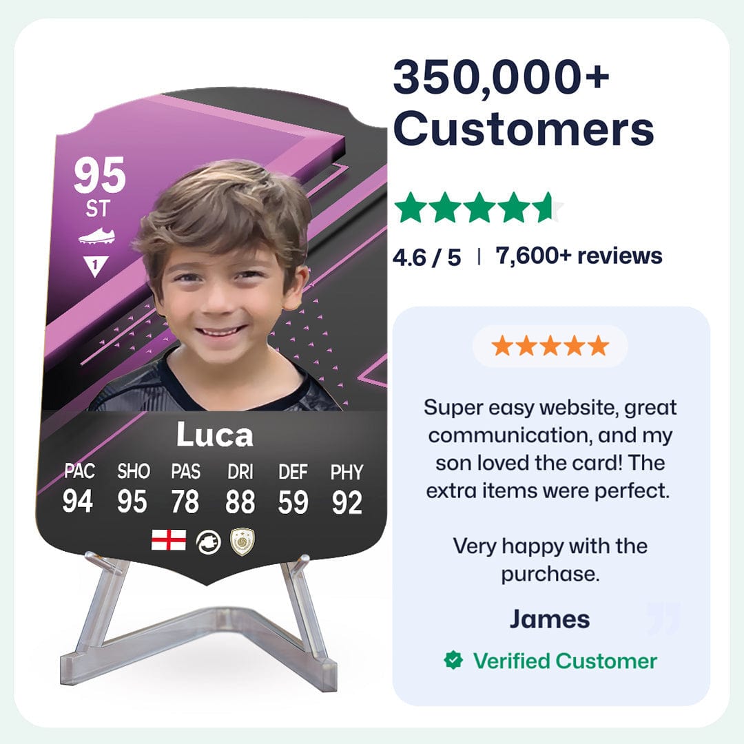 Once you’ve personalised your card, our design experts will edit your photo, design your card, and bring it to life in stunning quality. You’ll get a full preview before we print your card and every card’s quality is backed by our Gold Standard Guarantee. So far, over 350,000+ football fans agree: A CardsPlug football card is the ultimate football gift!