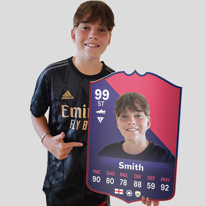 When it comes to personalising your card, the basic steps are to upload a photo and add a name to your card. Then you’ll add details like your player’s position and skill ratings out of 99 for each football skill shown on the card. Our online card builder makes this really easy. And if you aren’t a football card expert, don’t worry!