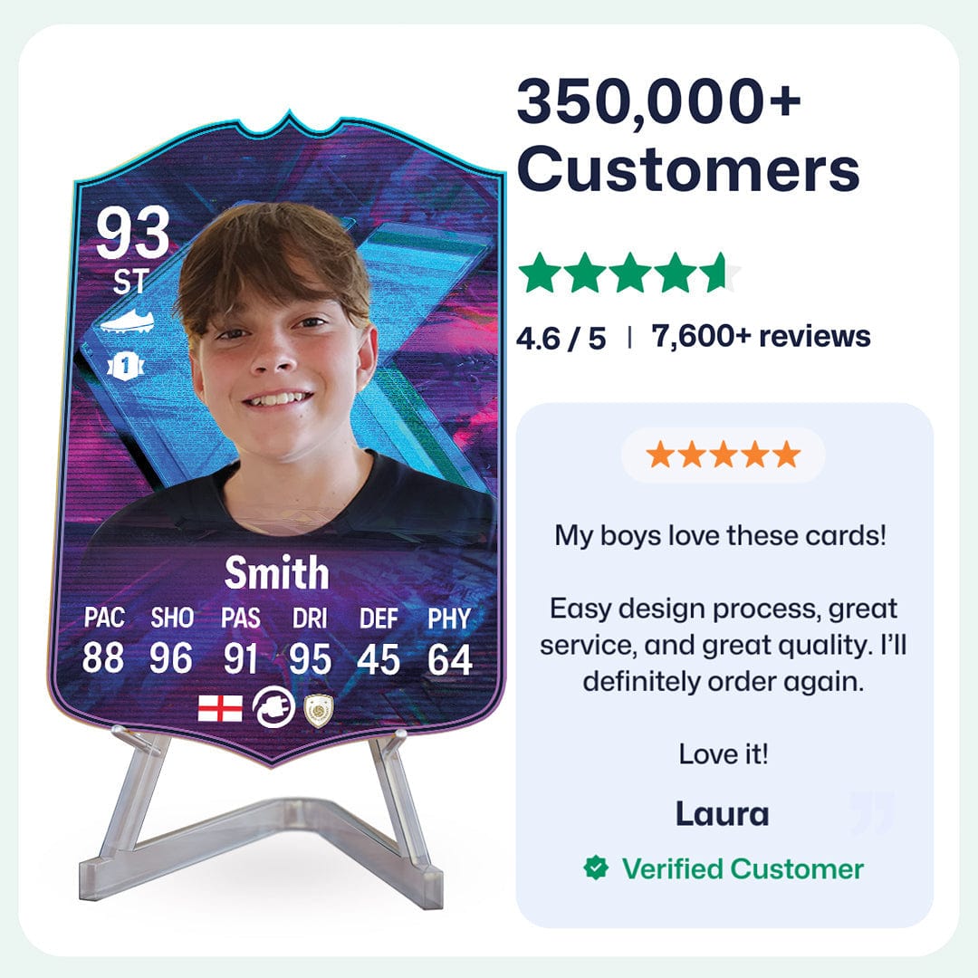 Yes! Our football card designers will remove the background from the photo you upload so it looks just like the football cards you might’ve seen games like EA FC 25, EA FC 24 or FIFA. We’ll also position the photo perfectly on the football card so it looks great. If there are any problems with the quality of your photo, we’ll reach out and let you know. Plus, our website's AI will remove the background on the image for visual purposes before purchase so you can see it without a background on the card.