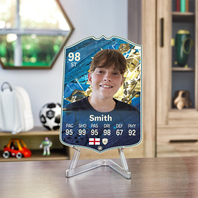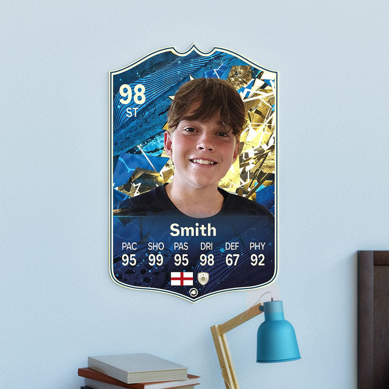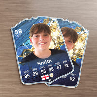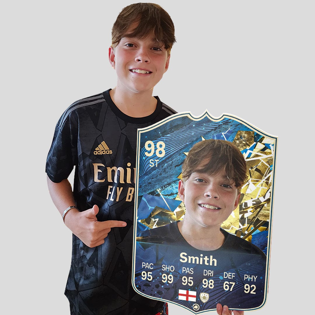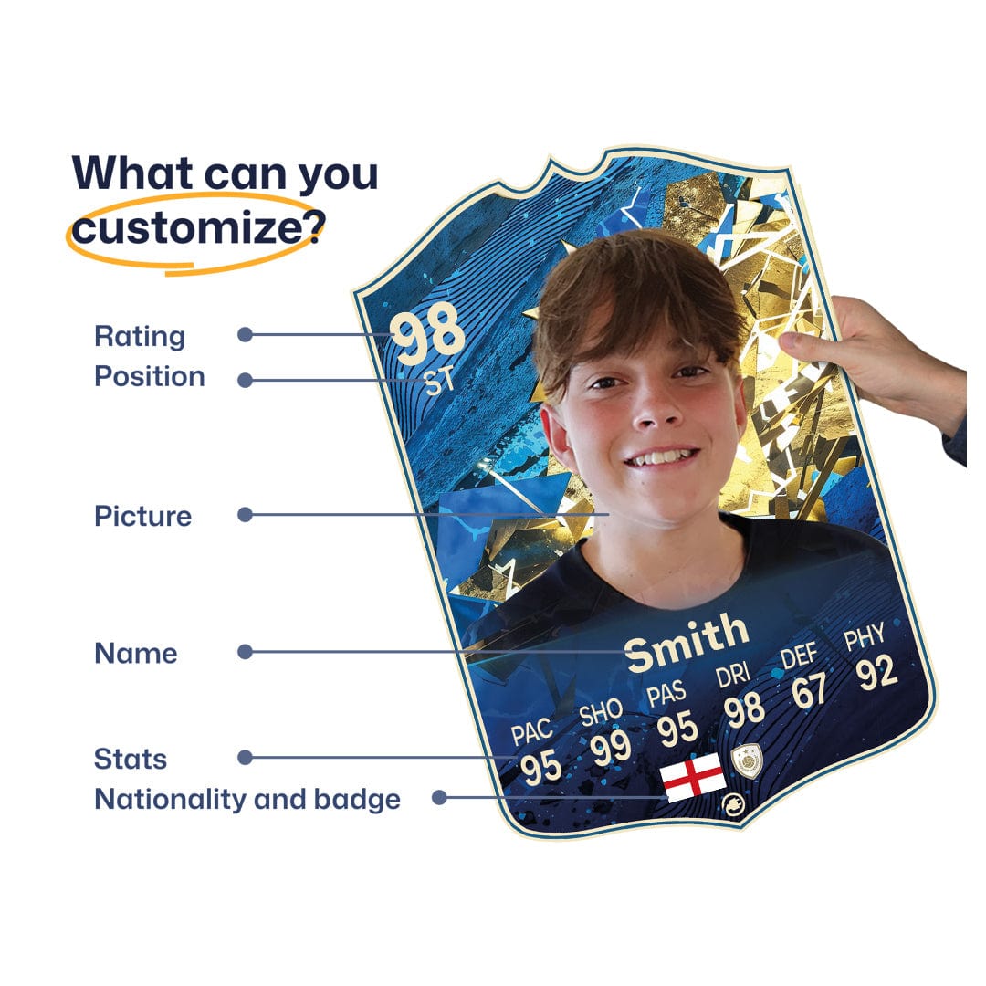 When it comes to personalising your card, the basic steps are to upload a photo and add a name to your card. Then you’ll add details like your player’s position and skill ratings out of 99 for each football skill shown on the card. Our online card builder makes this really easy. And if you aren’t a football card expert, don’t worry!