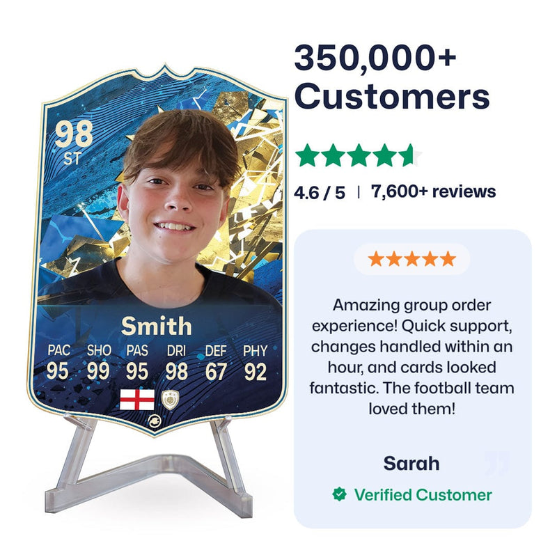 Yes! Our football card designers will remove the background from the photo you upload so it looks just like the football cards you might’ve seen games like EA FC 25, EA FC 24 or FIFA. We’ll also position the photo perfectly on the football card so it looks great. If there are any problems with the quality of your photo, we’ll reach out and let you know. Plus, our website's AI will remove the background on the image for visual purposes before purchase so you can see it without a background on the card.