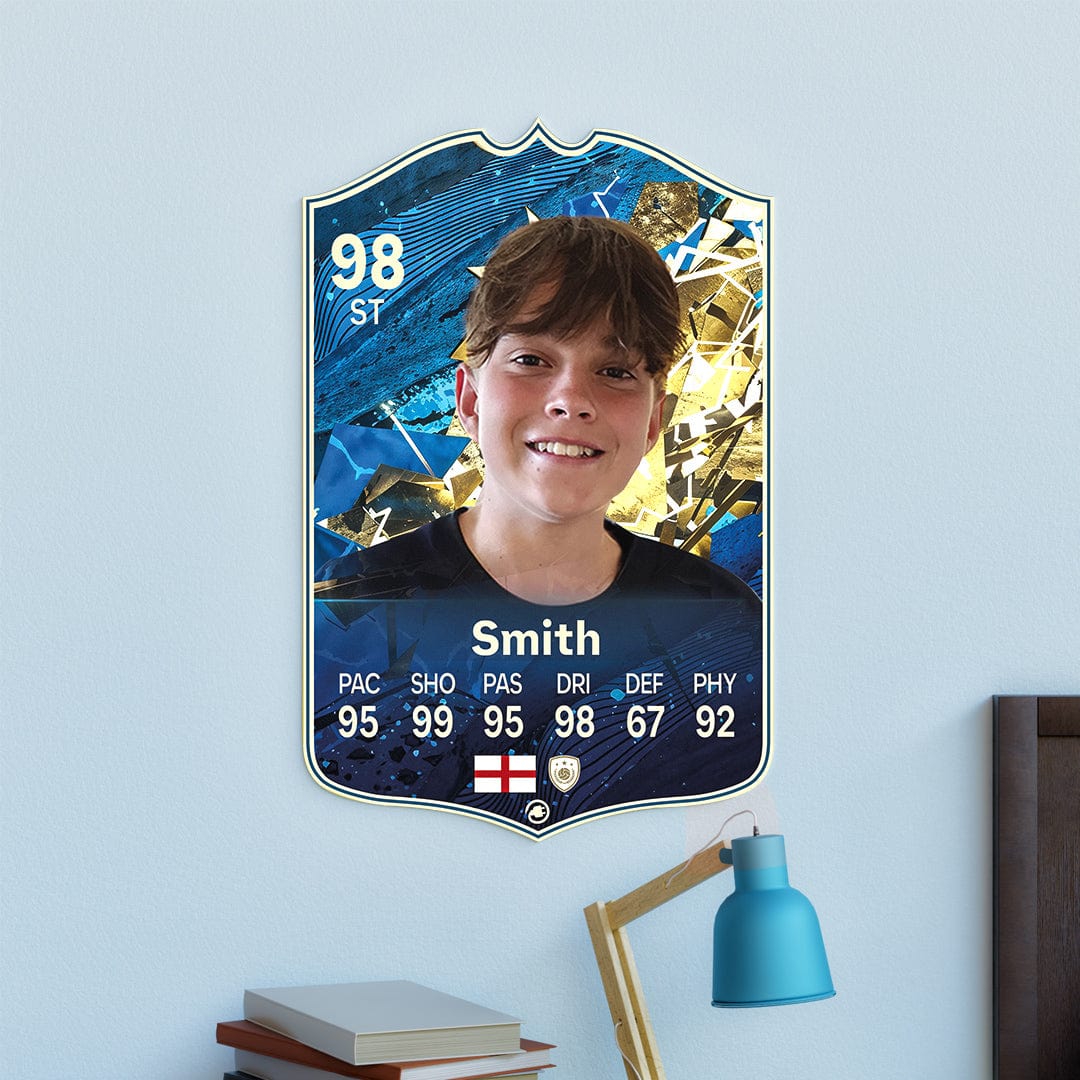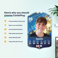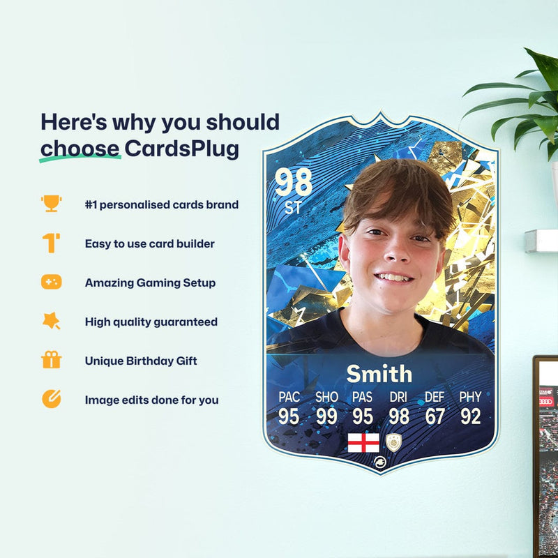 CardsPlug is home to the world’s favourite personalised football cards. Our easy football card builder lets you make a real life football card with your own name, photo, and skill ratings. With 100+ designs to choose from and some inspired by EA SPORTS FC 26 cards seen in EA FC 26, EA FC 25 and FC 24 as well as FIFA cards seen in games like FIFA 23 and FIFA 22.