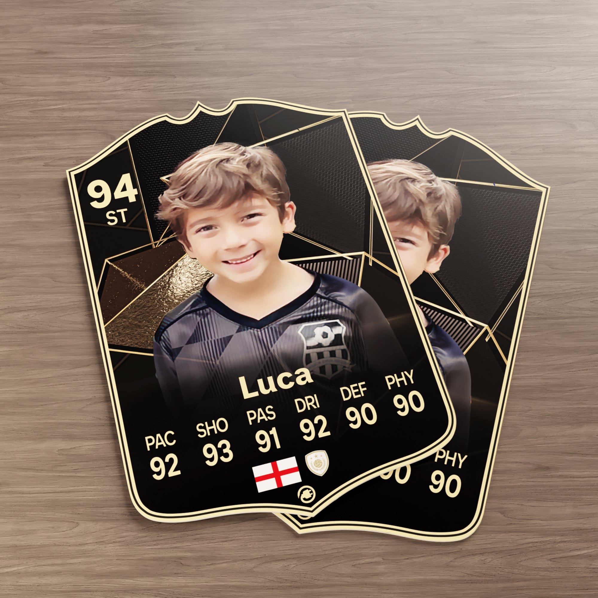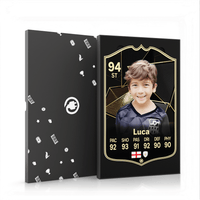 Our football card builder lets you choose between two different card materials. Our Standard cards are made of a ultra-strong variety of Foamex (not cardboard or foam!). This material has a lovely gloss finish and is also super durable. Our world-exclusive Metal football cards have a matte finish and are slightly heavier. Both look amazing and will last forever.