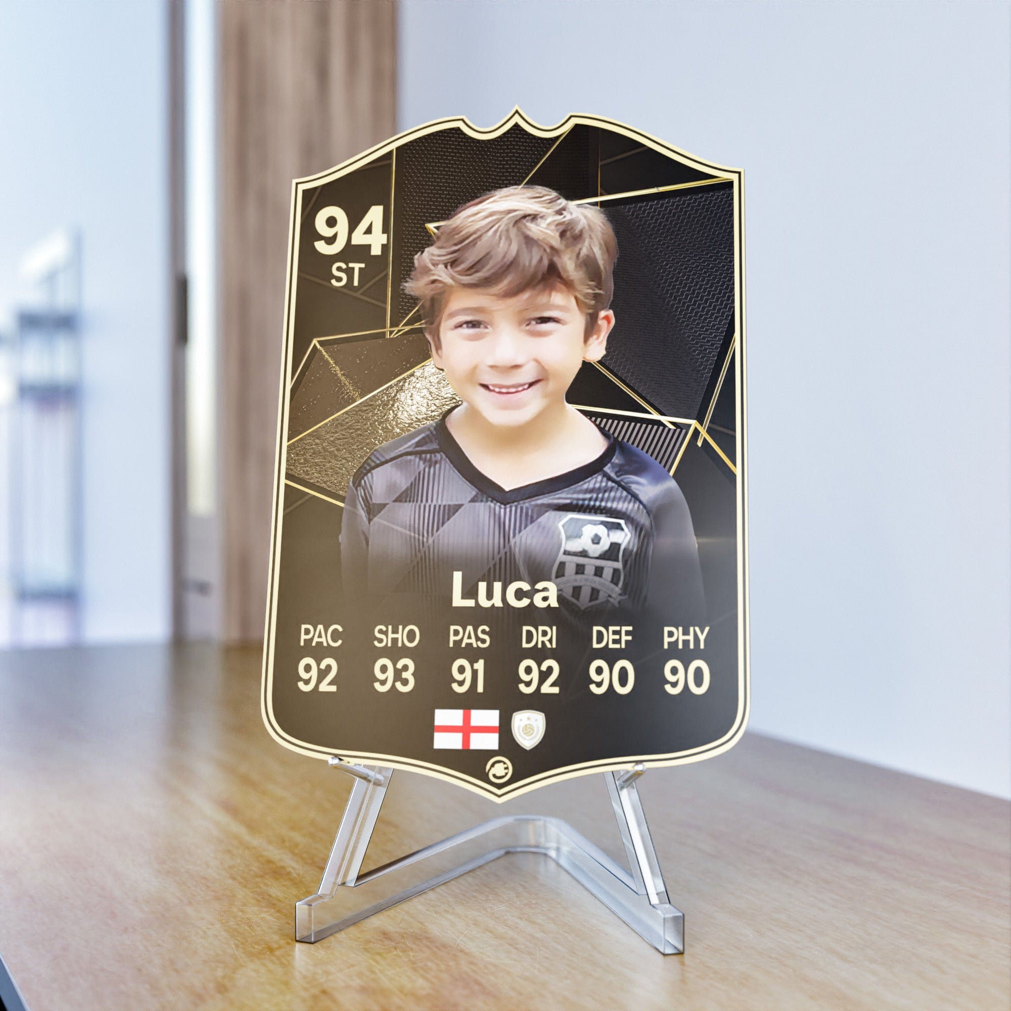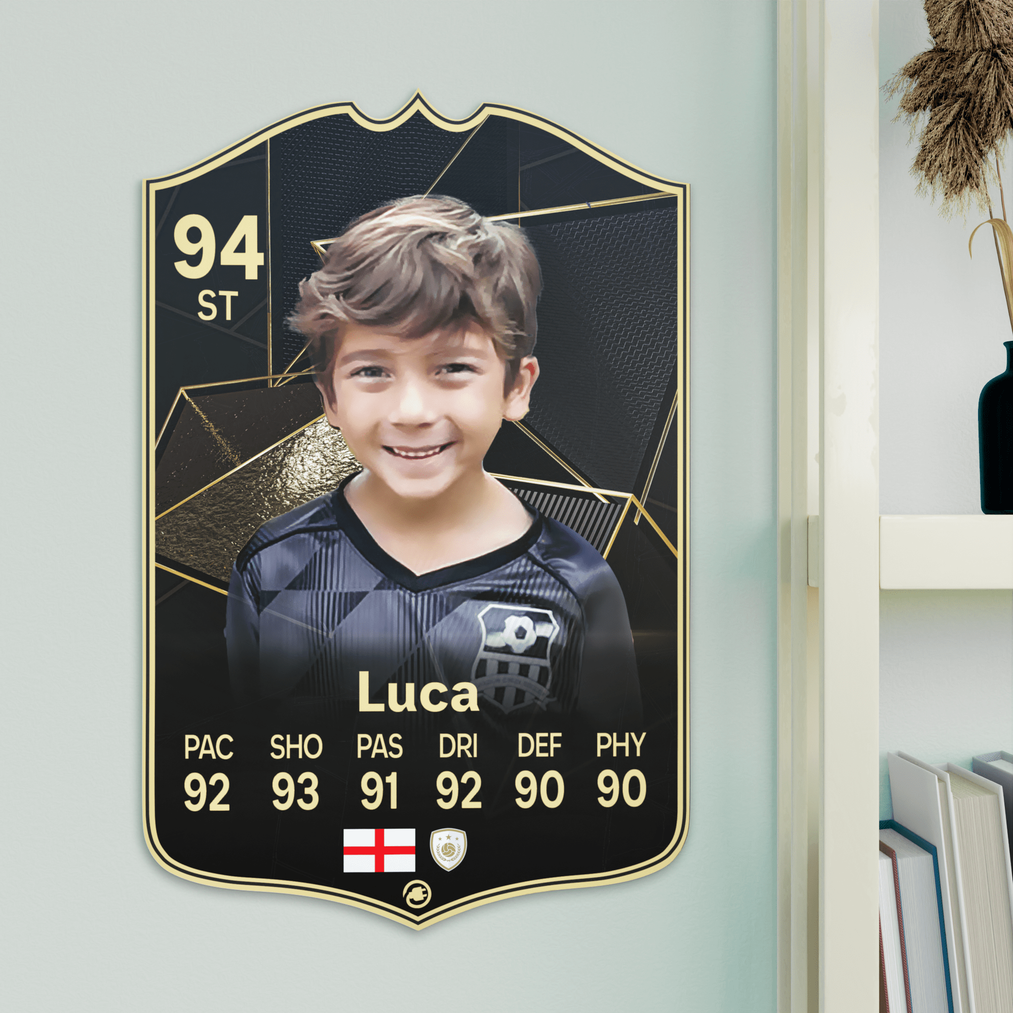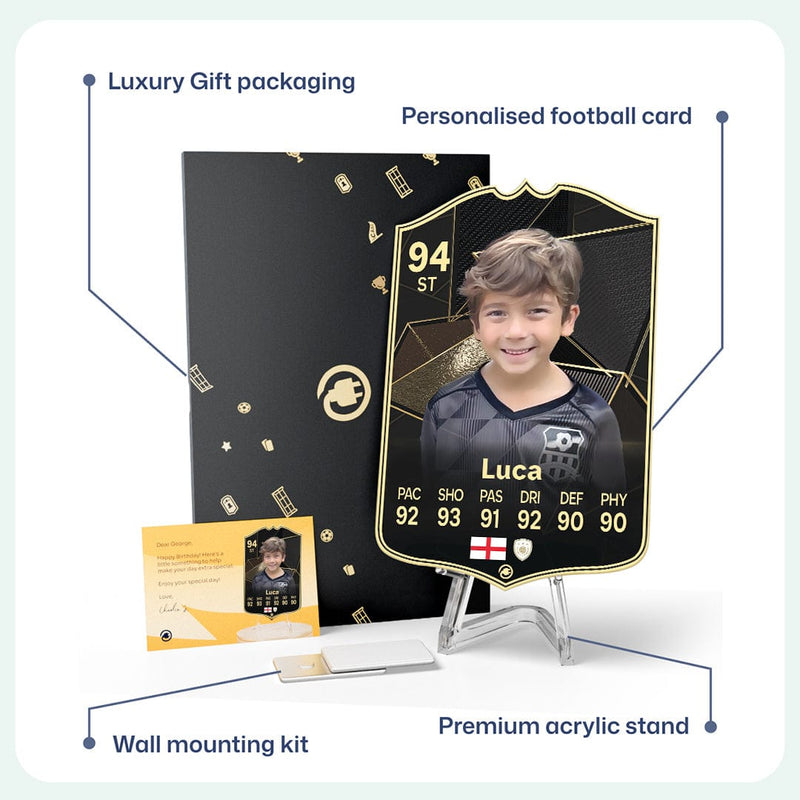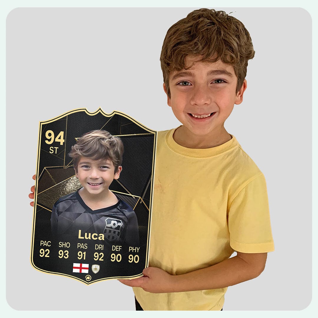 When it comes to personalising your card, the basic steps are to upload a photo and add a name to your card. Then you’ll add details like your player’s position and skill ratings out of 99 for each football skill shown on the card. Our online card builder makes this really easy. And if you aren’t a football card expert, don’t worry!