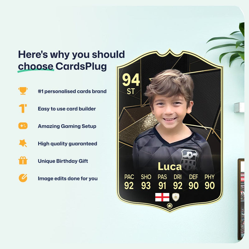 CardsPlug is home to the world’s favourite personalised football cards. Our easy football card builder lets you make a real life football card with your own name, photo, and skill ratings. With 100+ designs to choose from and some inspired by EA SPORTS FC 26 cards seen in EA FC 26, EA FC 25 and FC 24 as well as FIFA cards seen in games like FIFA 23 and FIFA 22.