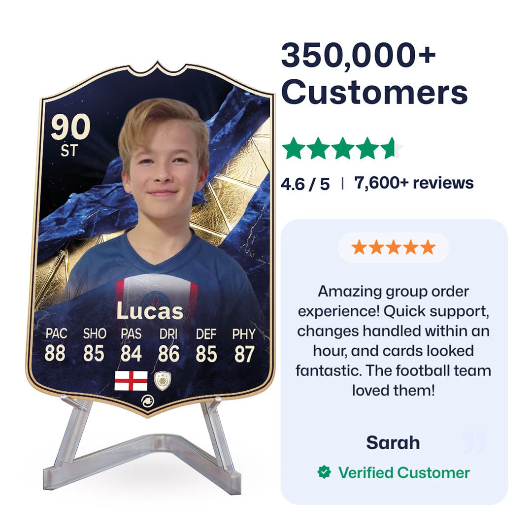 Once you’ve personalised your card, our design experts will edit your photo, design your card, and bring it to life in stunning quality. You’ll get a full preview before we print your card and every card’s quality is backed by our Gold Standard Guarantee. So far, over 350,000+ football fans agree: A CardsPlug football card is the ultimate football gift!