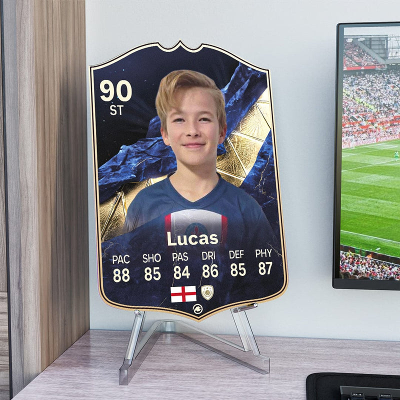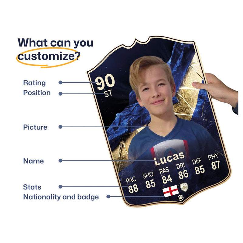 When it comes to personalising your card, the basic steps are to upload a photo and add a name to your card. Then you’ll add details like your player’s position and skill ratings out of 99 for each football skill shown on the card. Our online card builder makes this really easy. And if you aren’t a football card expert, don’t worry!