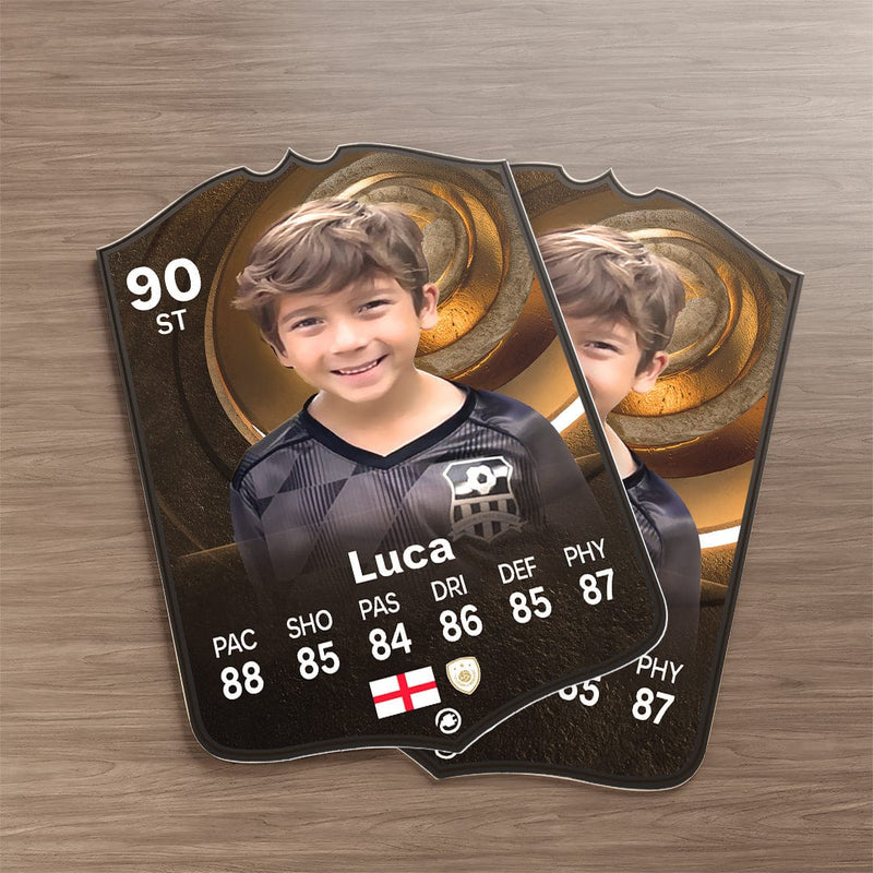 When it comes to personalising your card, the basic steps are to upload a photo and add a name to your card. Then you’ll add details like your player’s position and skill ratings out of 99 for each football skill shown on the card. Our online card builder makes this really easy. And if you aren’t a football card expert, don’t worry!