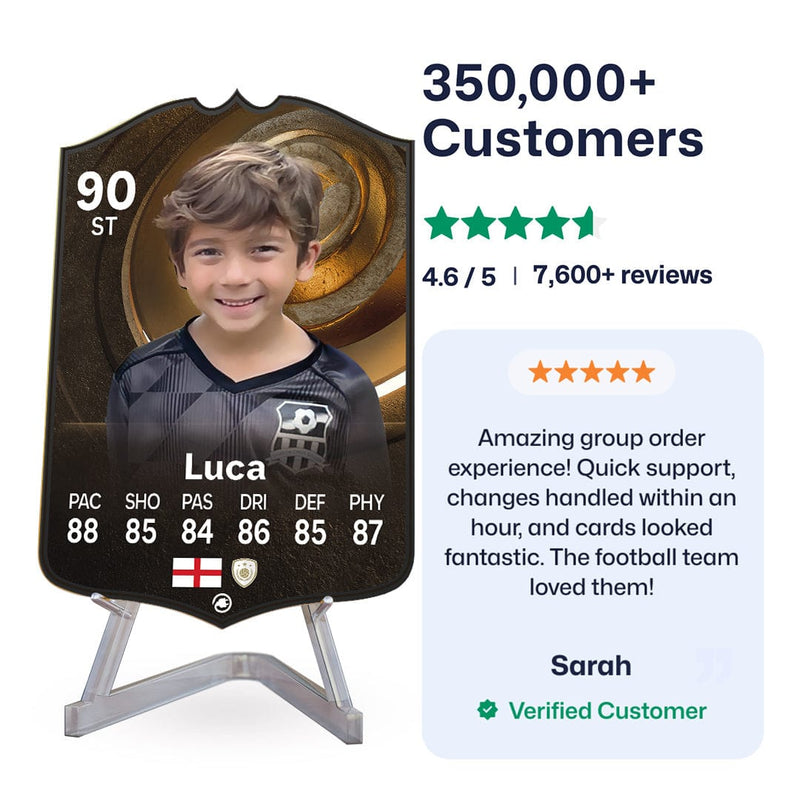Once you’ve personalised your card, our design experts will edit your photo, design your card, and bring it to life in stunning quality. You’ll get a full preview before we print your card and every card’s quality is backed by our Gold Standard Guarantee. So far, over 350,000+ football fans agree: A CardsPlug football card is the ultimate football gift!
