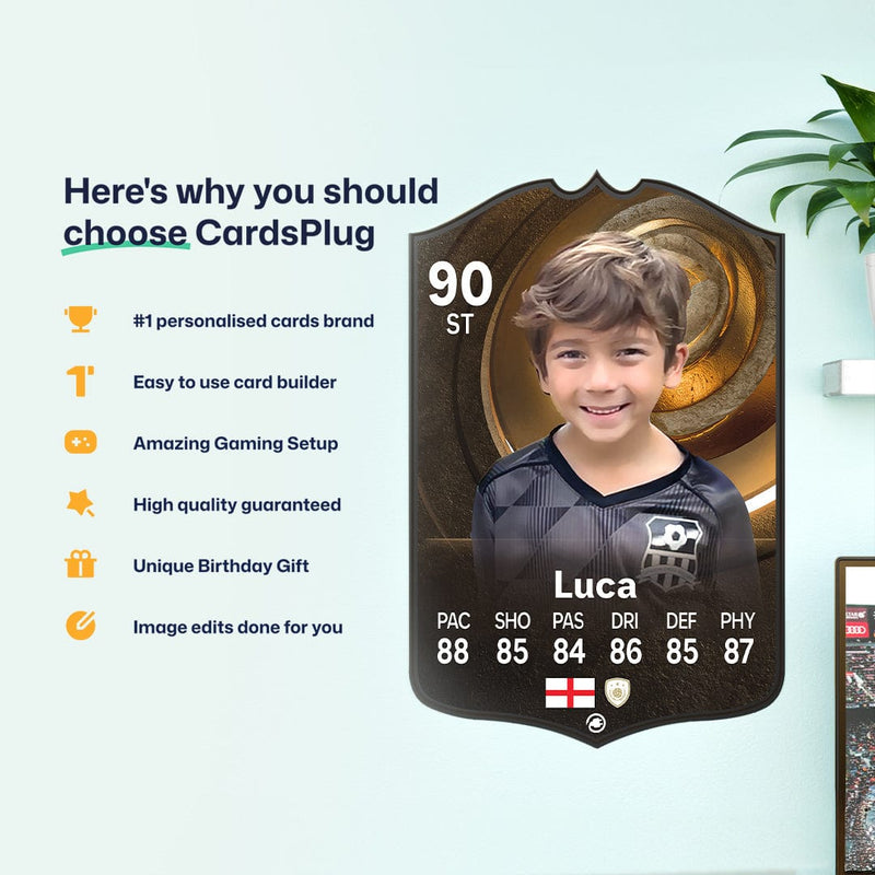 CardsPlug is home to the world’s favourite personalised football cards. Our easy football card builder lets you make a real life football card with your own name, photo, and skill ratings. With 100+ designs to choose from and some inspired by EA SPORTS FC 26 cards seen in EA FC 26, EA FC 25 and FC 24 as well as FIFA cards seen in games like FIFA 23 and FIFA 22.