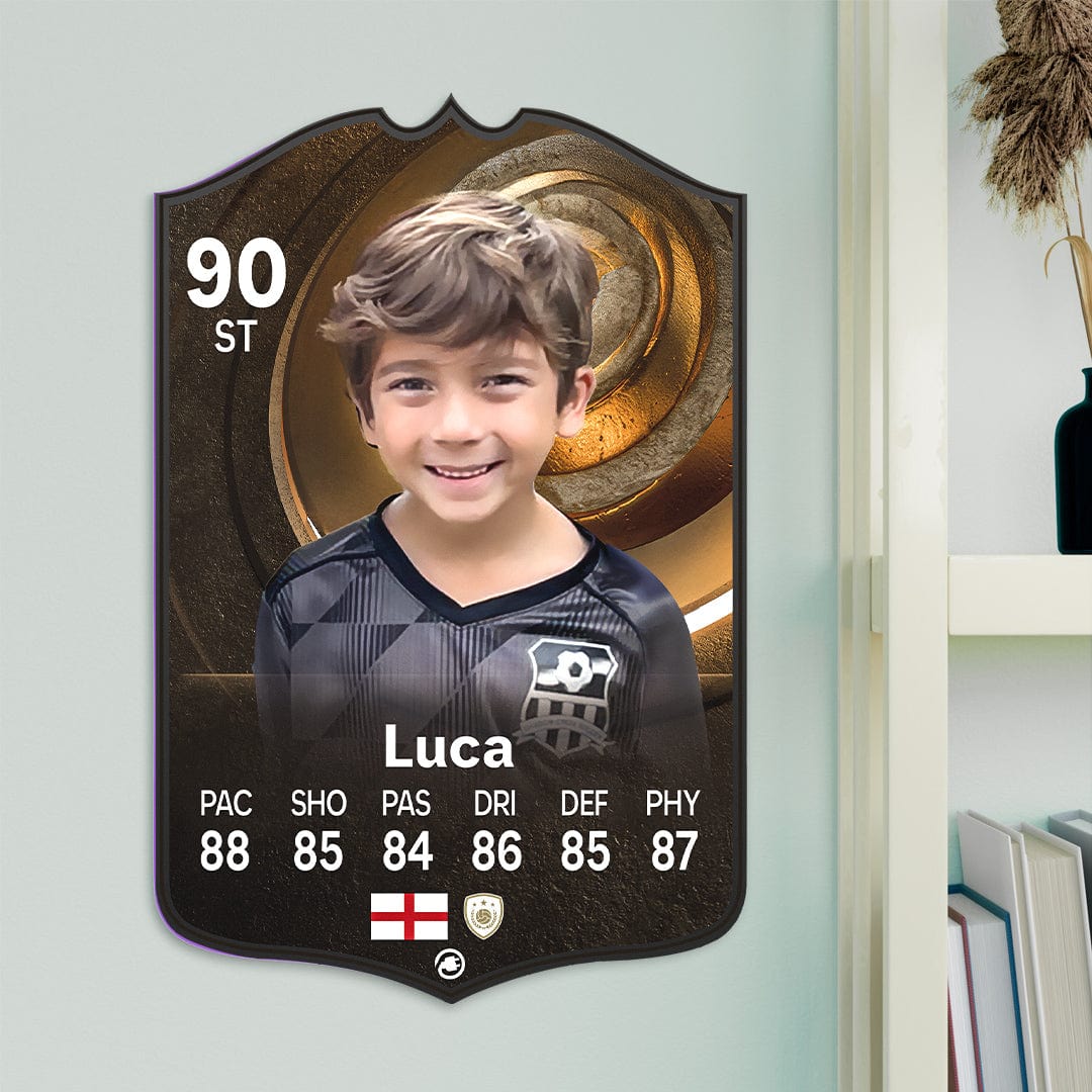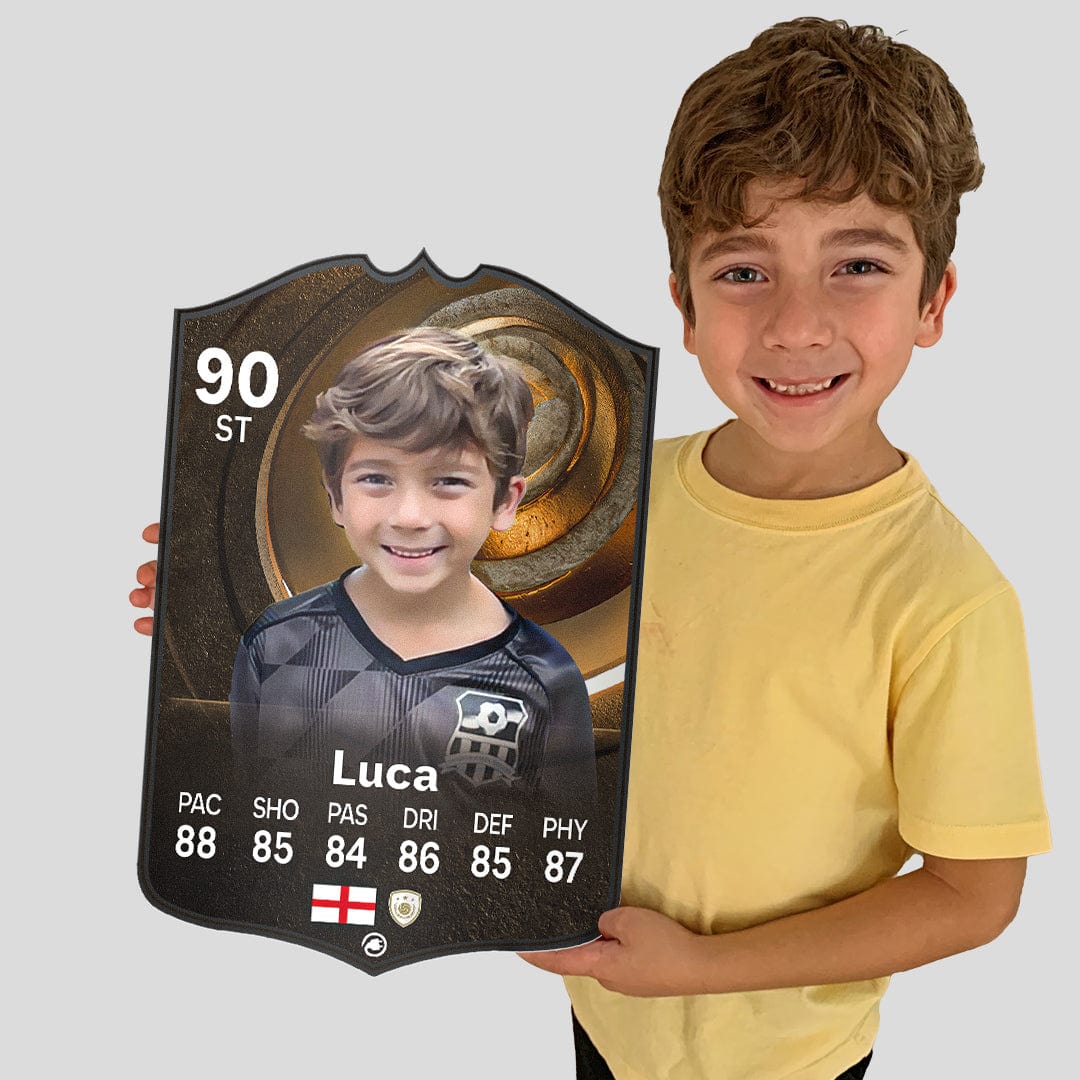 Our football card builder lets you choose between two different card materials. Our Standard cards are made of a ultra-strong variety of Foamex (not cardboard or foam!). This material has a lovely gloss finish and is also super durable. Our world-exclusive Metal football cards have a matte finish and are slightly heavier. Both look amazing and will last forever.