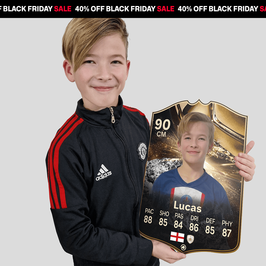 When it comes to personalising your card, the basic steps are to upload a photo and add a name to your card. Then you’ll add details like your player’s position and skill ratings out of 99 for each football skill shown on the card. Our online card builder makes this really easy. And if you aren’t a football card expert, don’t worry!