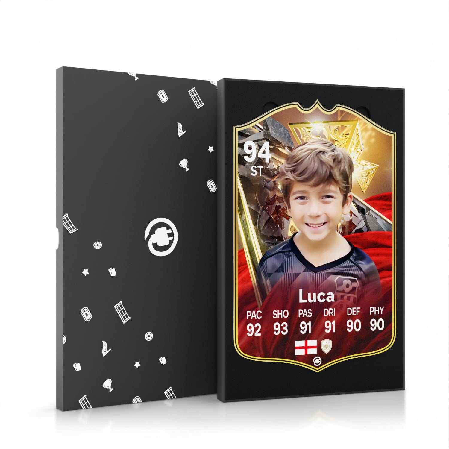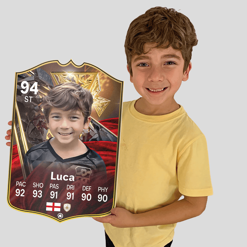 When it comes to personalising your card, the basic steps are to upload a photo and add a name to your card. Then you’ll add details like your player’s position and skill ratings out of 99 for each football skill shown on the card. Our online card builder makes this really easy. And if you aren’t a football card expert, don’t worry!
