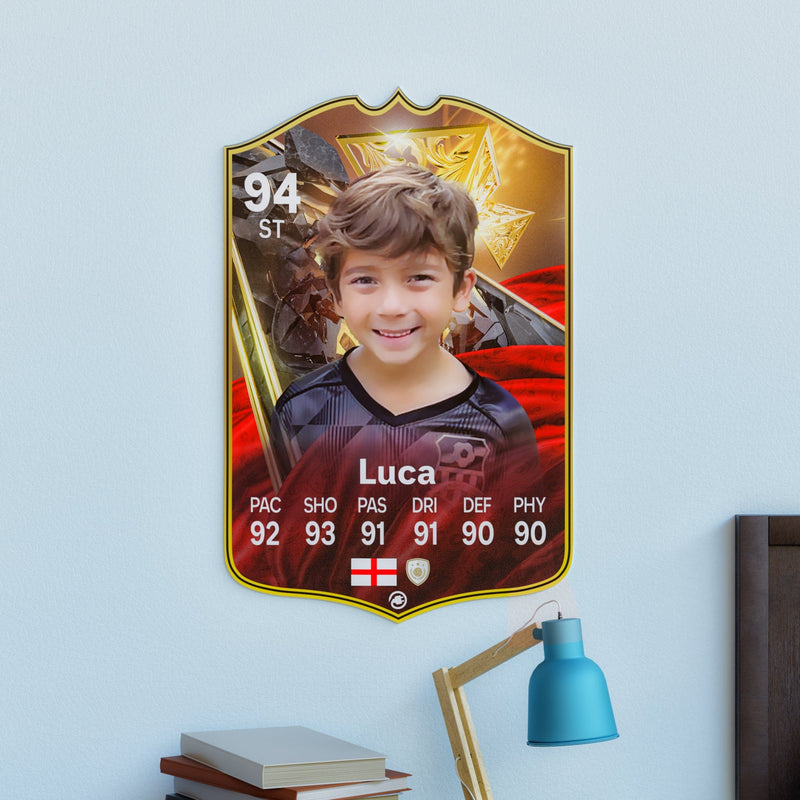 Our football card builder lets you choose between two different card materials. Our Standard cards are made of a ultra-strong variety of Foamex (not cardboard or foam!). This material has a lovely gloss finish and is also super durable. Our world-exclusive Metal football cards have a matte finish and are slightly heavier. Both look amazing and will last forever.