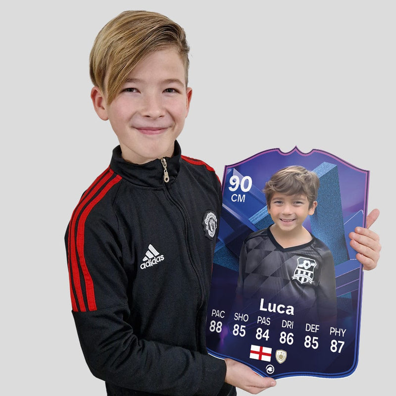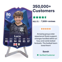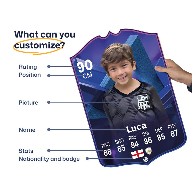 When it comes to personalising your card, the basic steps are to upload a photo and add a name to your card. Then you’ll add details like your player’s position and skill ratings out of 99 for each football skill shown on the card. Our online card builder makes this really easy. And if you aren’t a football card expert, don’t worry!