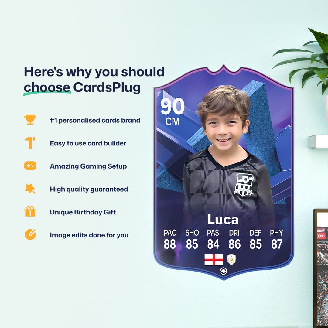CardsPlug is home to the world’s favourite personalised football cards. Our easy football card builder lets you make a real life football card with your own name, photo, and skill ratings. With 100+ designs to choose from and some inspired by EA SPORTS FC 26 cards seen in EA FC 26, EA FC 25 and FC 24 as well as FIFA cards seen in games like FIFA 23 and FIFA 22.