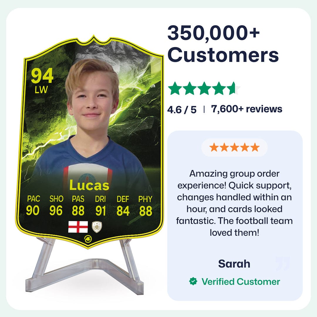 Once you’ve personalised your card, our design experts will edit your photo, design your card, and bring it to life in stunning quality. You’ll get a full preview before we print your card and every card’s quality is backed by our Gold Standard Guarantee. So far, over 350,000+ football fans agree: A CardsPlug football card is the ultimate football gift!
