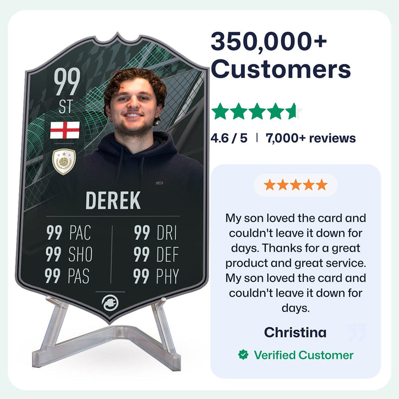 Once you’ve personalised your card, our design experts will edit your photo, design your card, and bring it to life in stunning quality. You’ll get a full preview before we print your card and every card’s quality is backed by our Gold Standard Guarantee. So far, over 350,000+ football fans agree: A CardsPlug football card is the ultimate football gift!