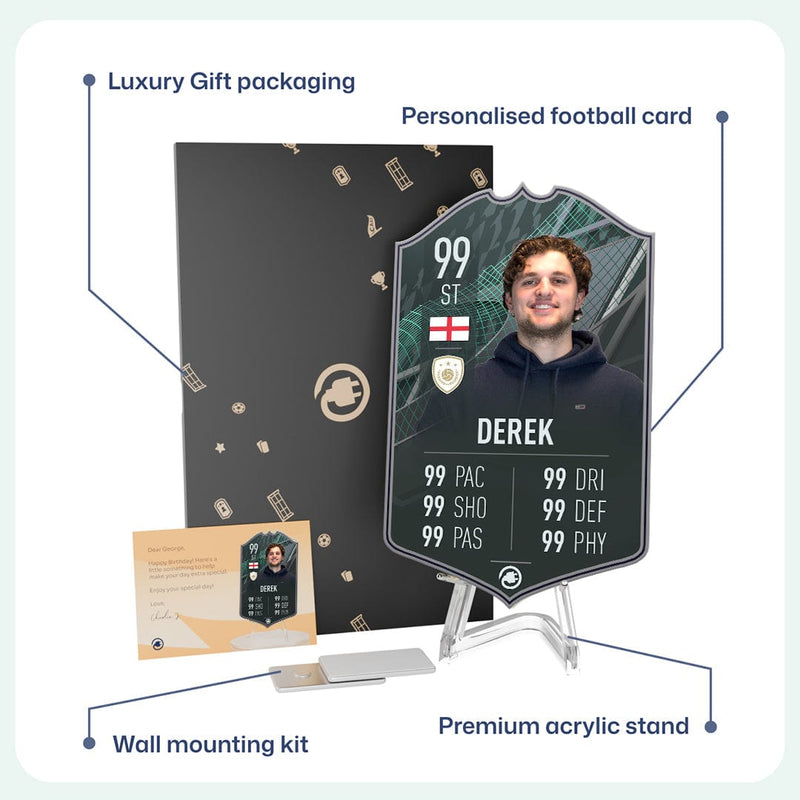 When it comes to personalising your card, the basic steps are to upload a photo and add a name to your card. Then you’ll add details like your player’s position and skill ratings out of 99 for each football skill shown on the card. Our online card builder makes this really easy. And if you aren’t a football card expert, don’t worry!