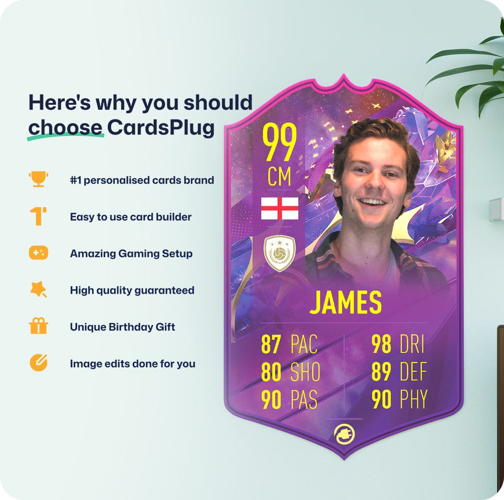 CardsPlug is home to the world’s favourite personalised football cards. Our easy football card builder lets you make a real life football card with your own name, photo, and skill ratings. With 100+ designs to choose from and some inspired by EA SPORTS FC 26 cards seen in EA FC 26, EA FC 25 and FC 24 as well as FIFA cards seen in games like FIFA 23 and FIFA 22.